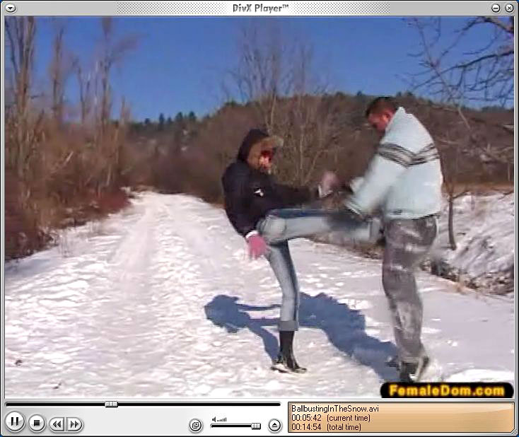 Denise and her friend is out having fun in the snow. Her friend is too brutal to her so Denise have to use the only weapon she knows which is going for the balls. Lots of ballbusting with boots trample facesitting and more.